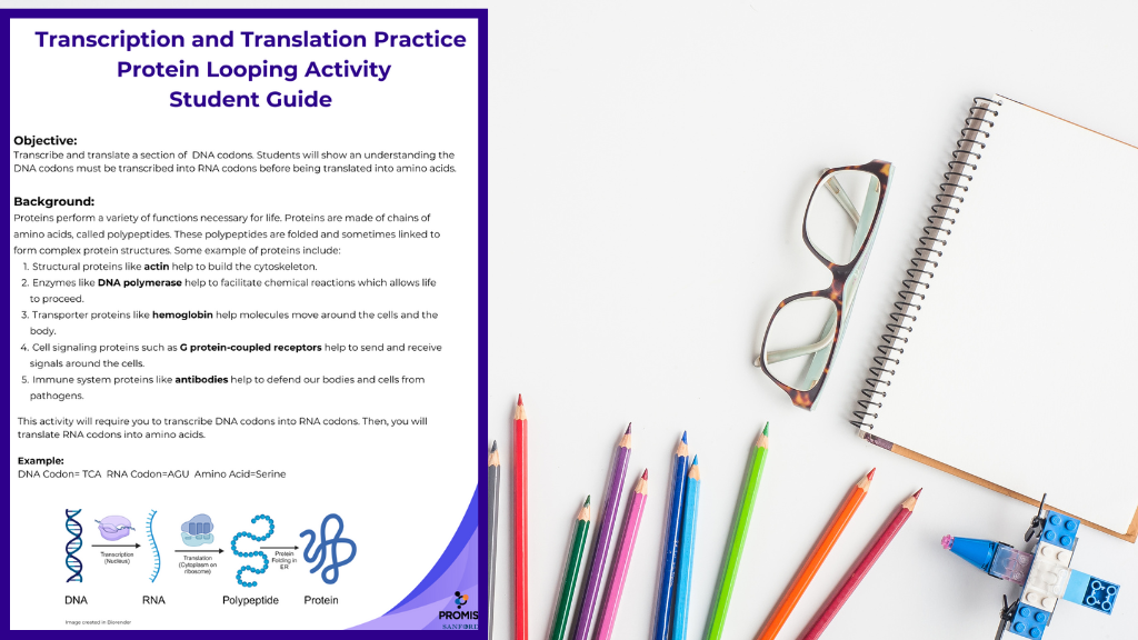 Print the Transcription and Translation Activity Posters. This is a PDF so you can choose whether to use full or half sheets for each poster in printer settings. Hang the posters up around the classroom or down the hall, the order does not matter.